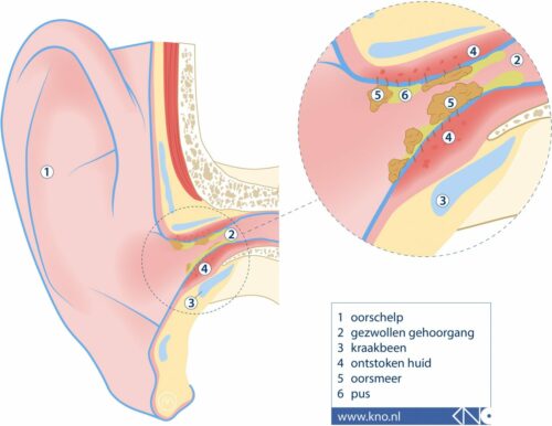 Jeuk en pijn in het oor, vol gevoel, roodheid en zwelling en vochtige afscheiding uit het oor. Als het trommelvlies aangedaan wordt is het gehoor minder.